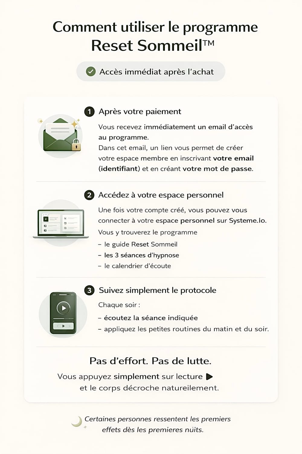 Dès la validation de votre paiement, vous recevrez un email avec un lien d’accès immédiat au programme, dans votre espace system io.